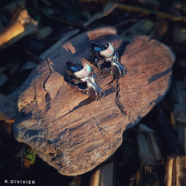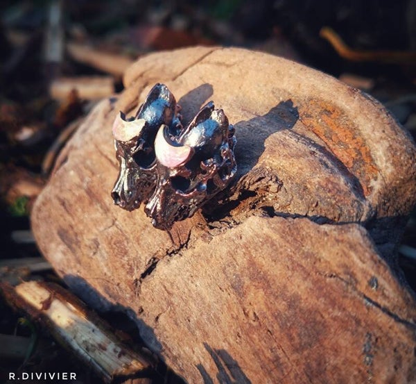 Verkupfert habe ich hier Miniaturschädel vom Wolf mit einem magischem Mond und Fledermaus mit Bergkristallspitzen.