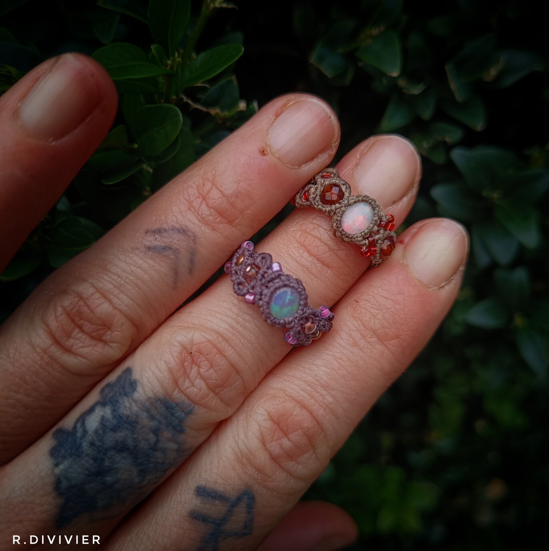 Diese Ringe sind handgeknüpft, mit äthiopischen Opalen, Glasperlen und Hessonitperlen.