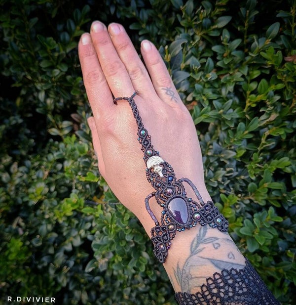 Handgeknüpfter Makrameeschmuck mit Purpurit, Hämatit- und schwarzen Turmalinperlen.