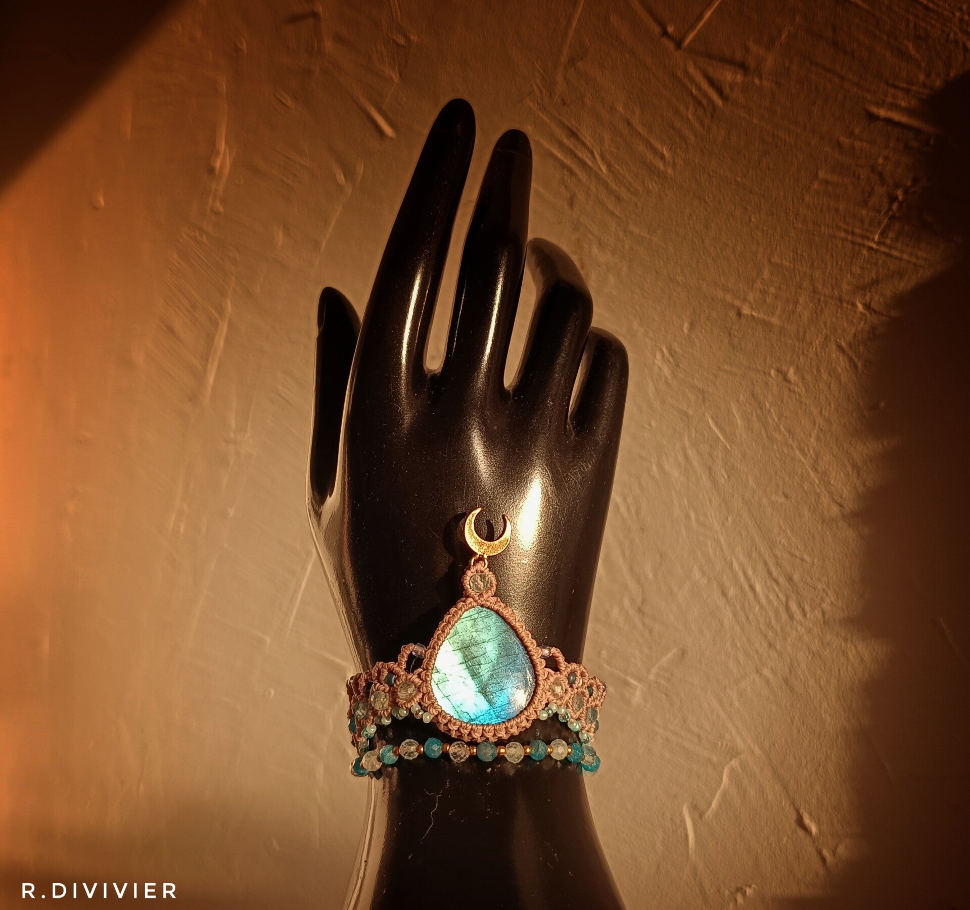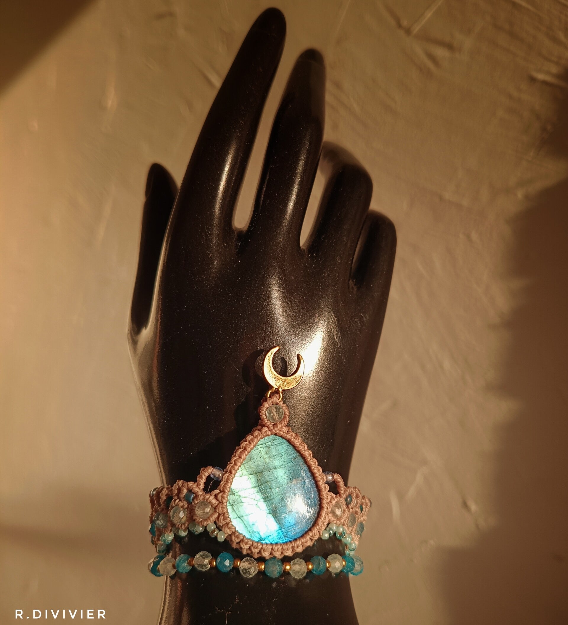 Handgeknüpftes Armband mit einem atemberaubenden Labradorit dazu kommen Aquamarin- und Apatitperlen.