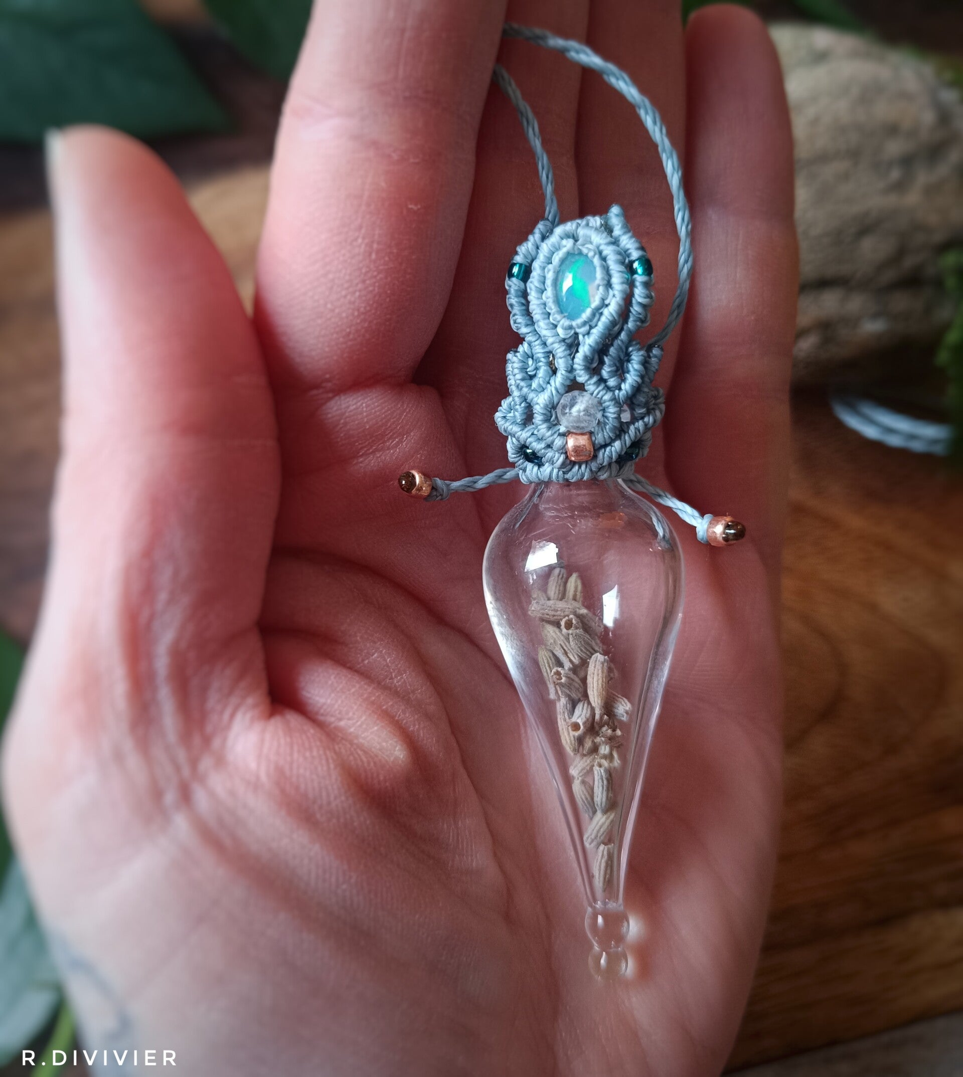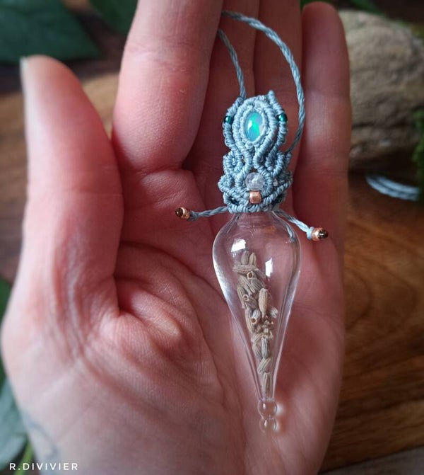 Befüllbat mit den Zutaten, die für dich wichtig sind, ob Parfüm oder Kräuter es geht ganz geschwind. Um es als Zierde am Halse zu tragen, wurde es befestigt an einem Faden. Hör nun in dich hinein, denn willst du es tauschen musst du deinem Inneren lauschen, was darf es sein, was brauchst du jetzt? Der Phantasie sind da keine Grenzen gesetzt. Der kunstvoll handgeknüpfte Halter mit Labradorit und Opal, lässt sich schnell öffnen ganz ohne Qual.