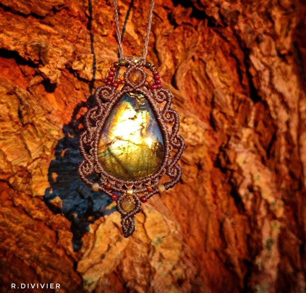 Eingeknüpft habe ich einen wunderschönen Labradorit und grüne Garnatperlen sowie Glasperlen.
