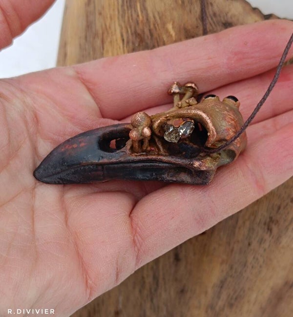Verkupferter Miniaturschädel mit Pilzen, der Rune für Vergänglichkeit sowie Petroleumquarz und Onyx.