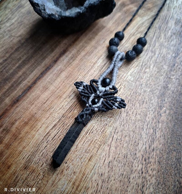 Handgeknüpfte Makrameekette mit Rauchquarz, Onyx- und Lavaperlen.