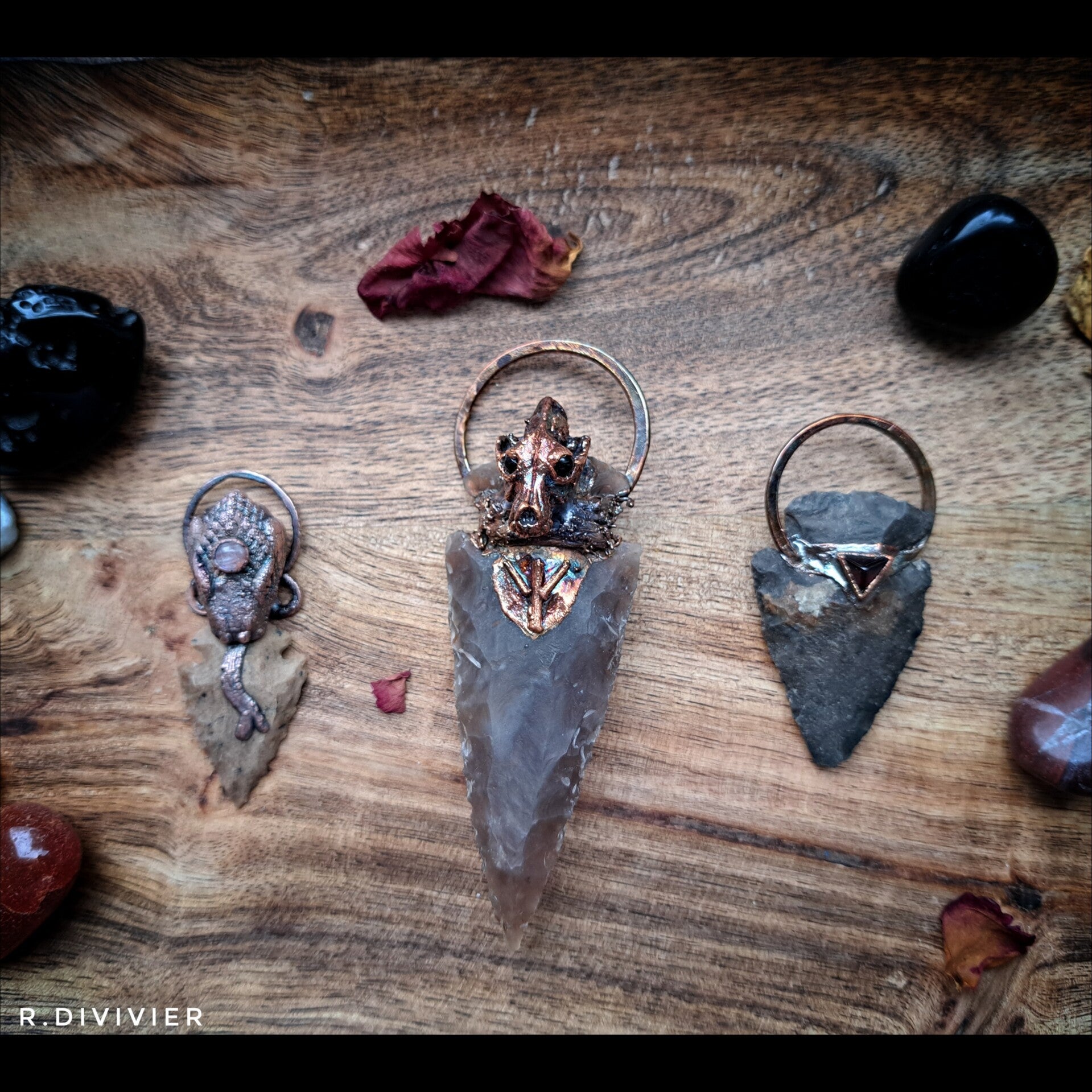 Eine Feuersteinspitze mit Wolfschädel, Onyx und der Rune Algiz, zum Schutz.