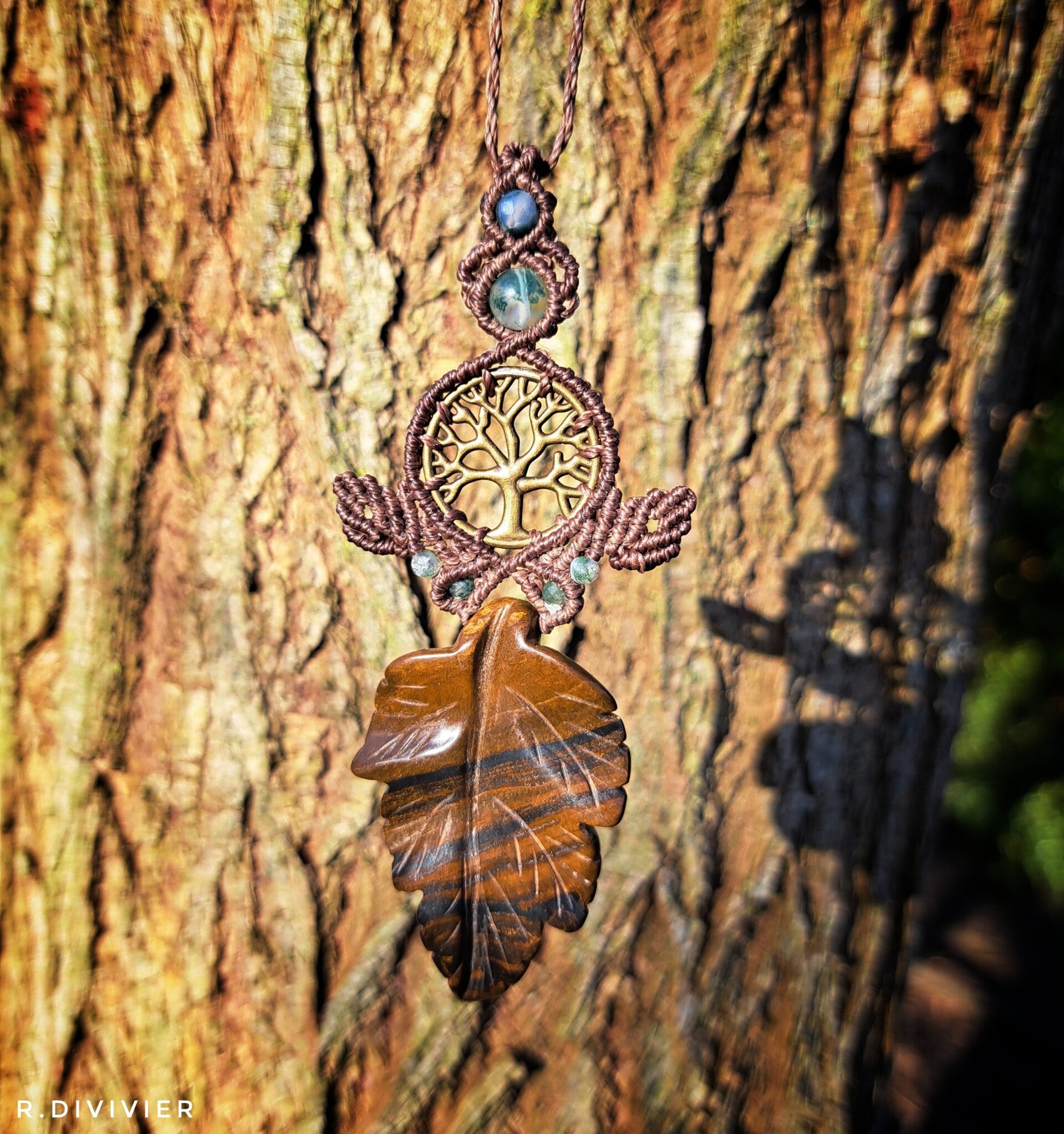 Eine handgeknüpfte Makrameekette mit einem Blatt aus Tigereisen und Moosachatperlen soll deine Verbindung sein.