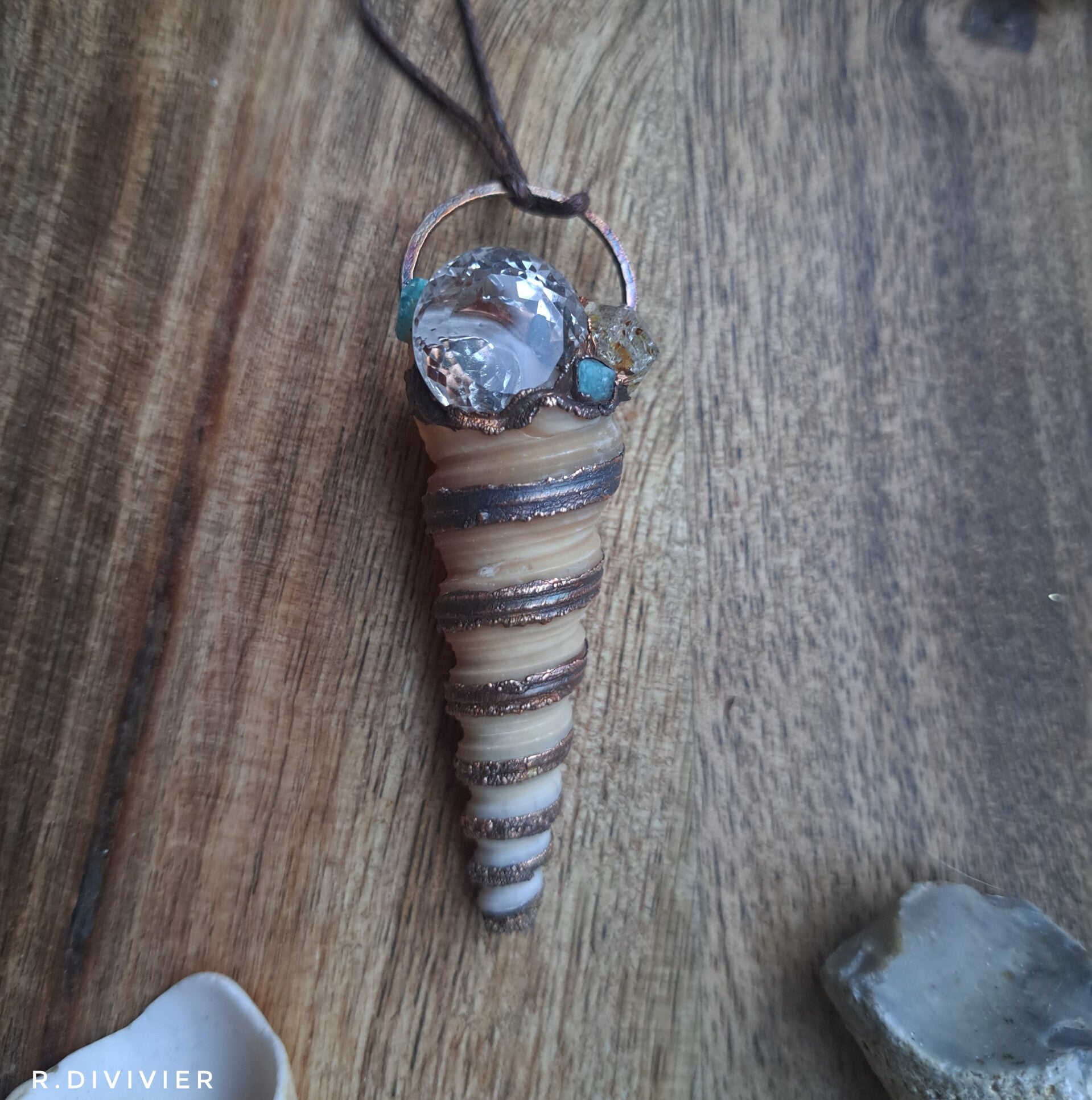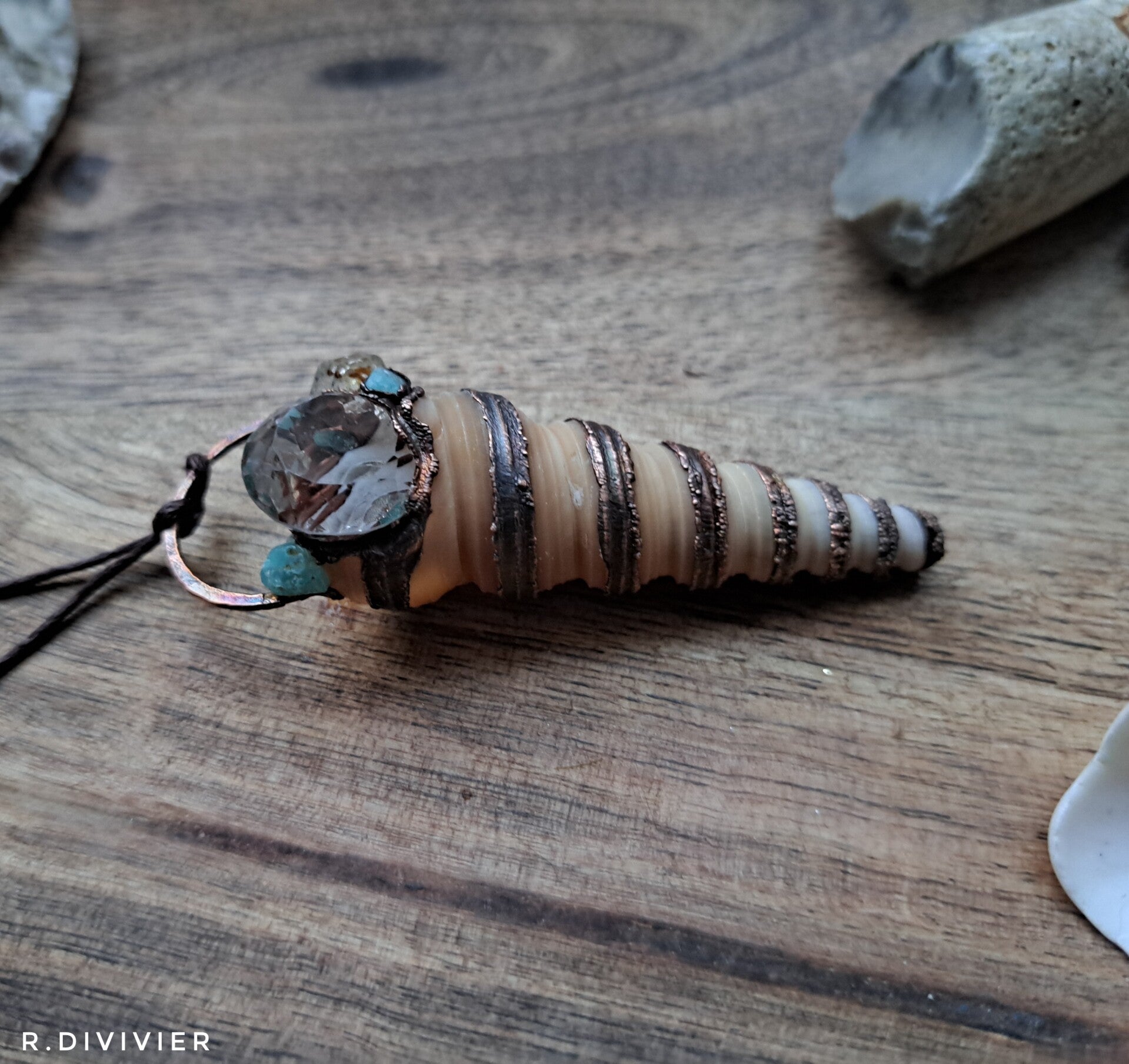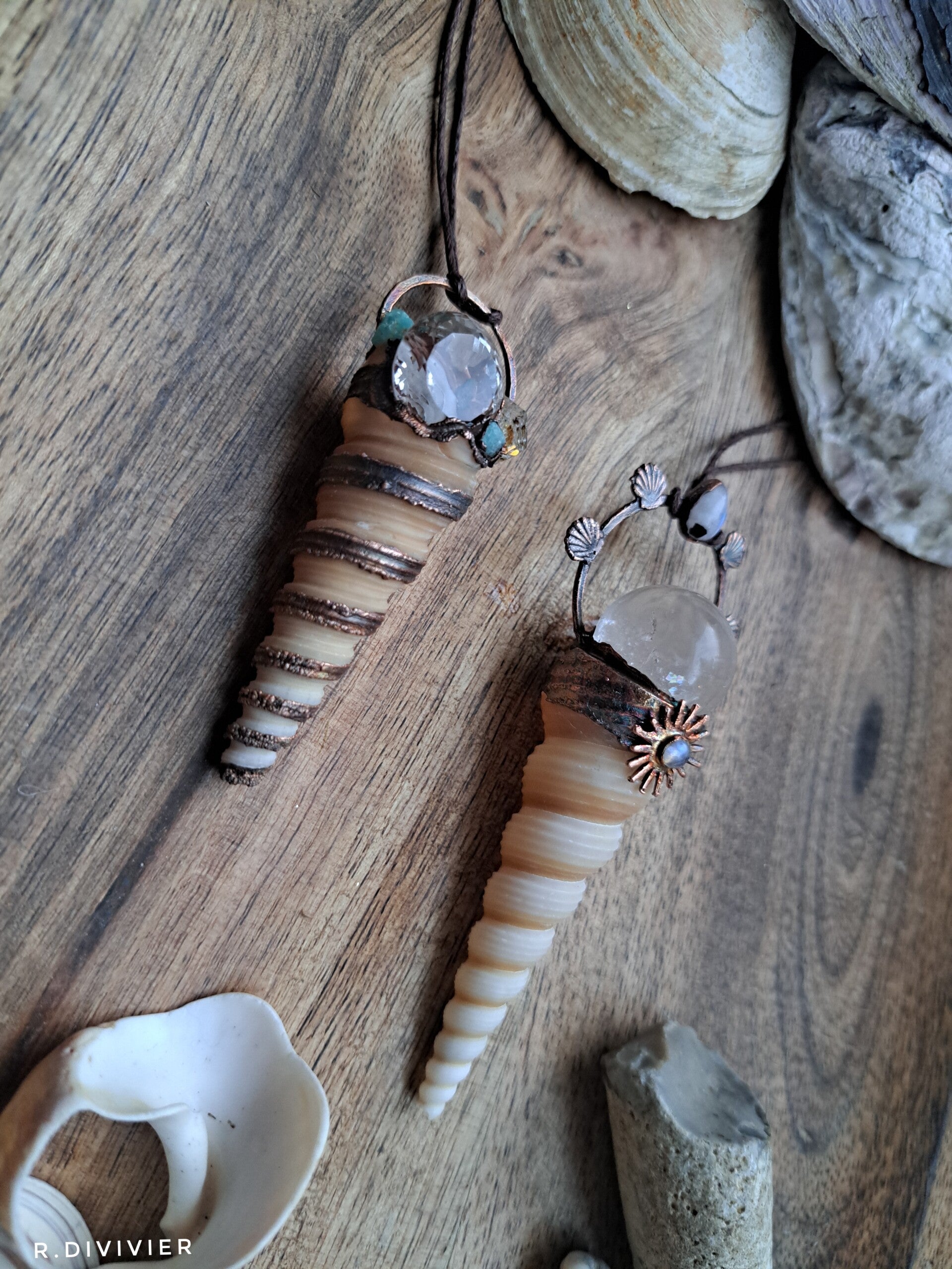 Zwei wunderschöne verkupferte Schnecken mit Bergkristallkugel und weißem Labradorit oder facettiertem Bergkristall,Amazonit und Petroleumquarz (letzterer ist UV aktiv und leuchtet unter Schwarzlicht)