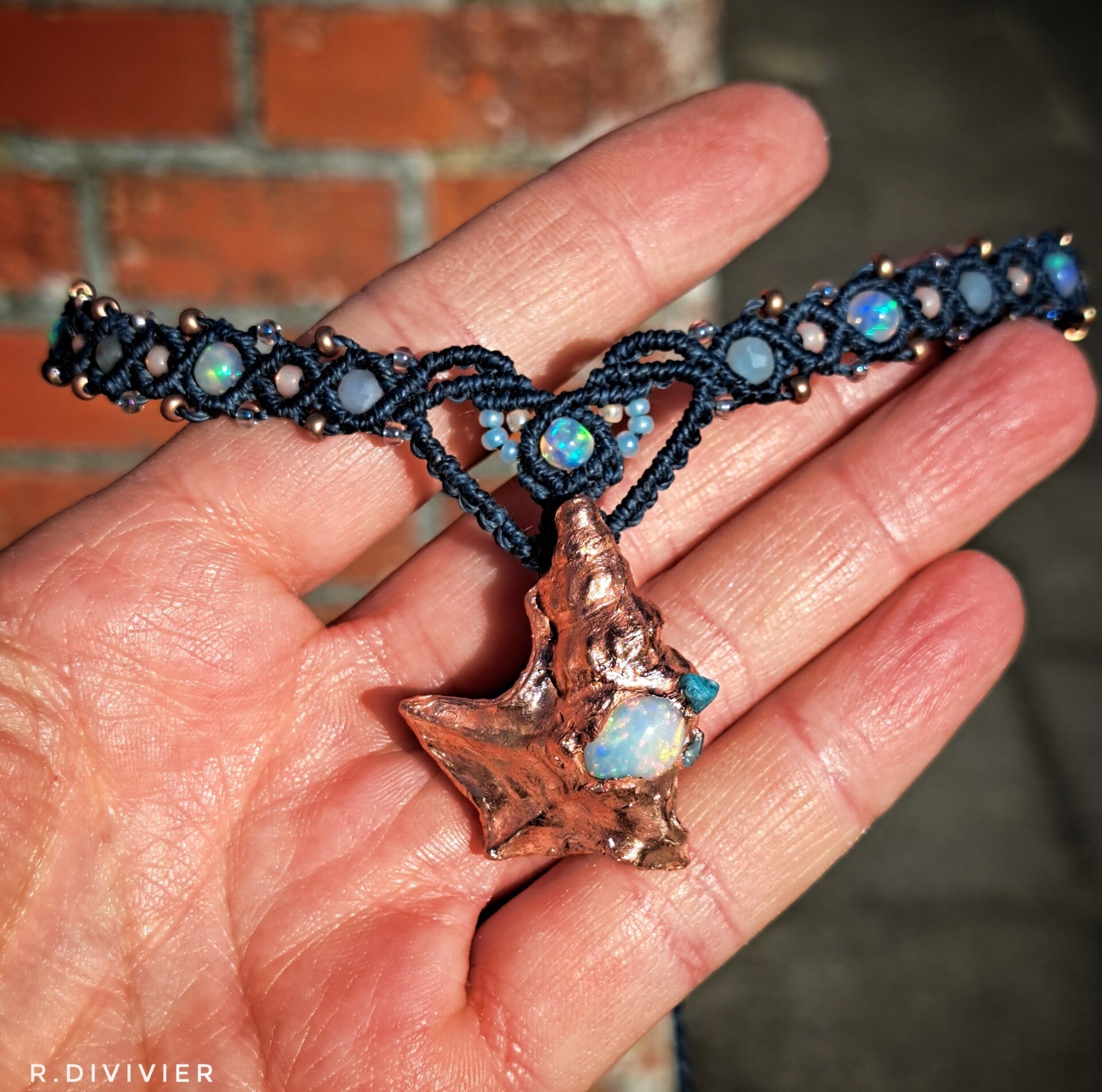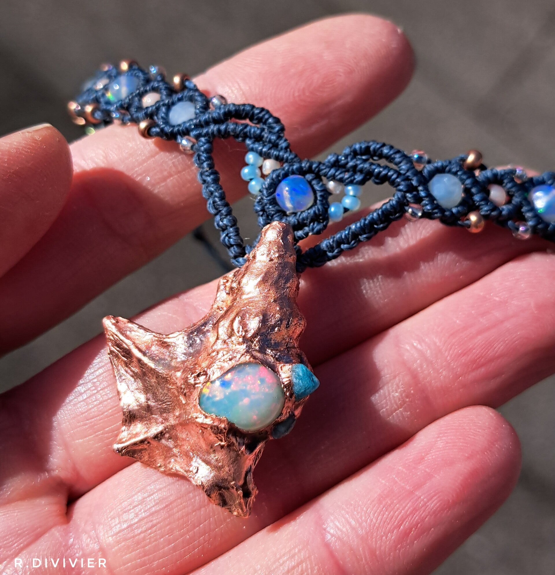 Handgeknüpfte Makrameekette mit Amazonit, Opal und verkupfertem Pelikanfuss.